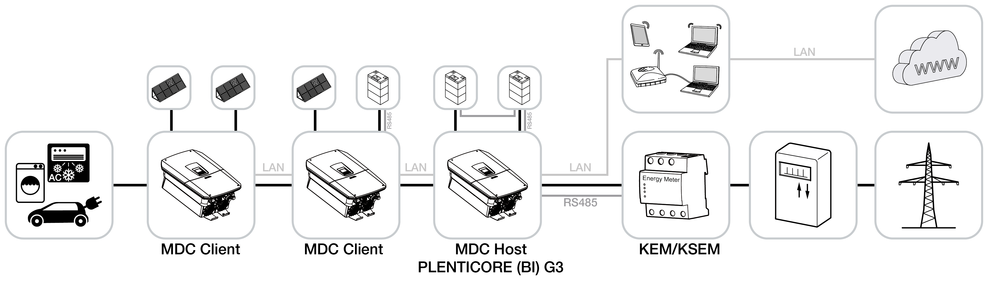 Multi Device Control (MDC) slouží k monitorování a ovládání střídačů kompatibilních s MDC a dalších zařízení kompatibilních s MDC ve stejné domácí síti. Řídicí úlohu přebírá střídač PLENTICORE G3, který byl nakonfigurován jako hostitelský střídač MDC. Hostitelský střídač MDC může být provozován bez baterie nebo s baterií. Pokud je v systému použita baterie, musí být baterie s největší kapacitou připojena k hostitelskému střídači MDC.