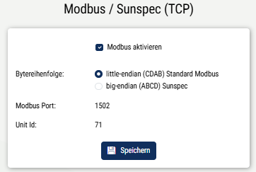 Einstellungen > Modbus / Sunspec (TCP) > Modbus aktivieren.