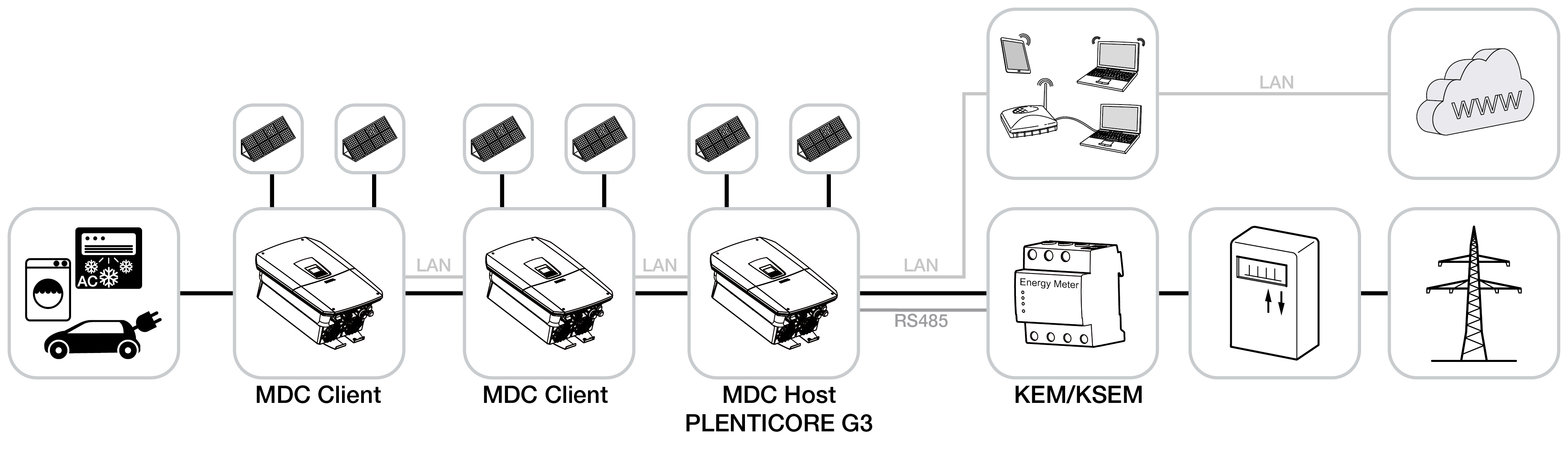 Sieć urządzeń składająca się z falowników fotowoltaicznych bez rozszerzenia produktu „Sterowanie akumulatorem za pomocą MDC” na hoście MDC