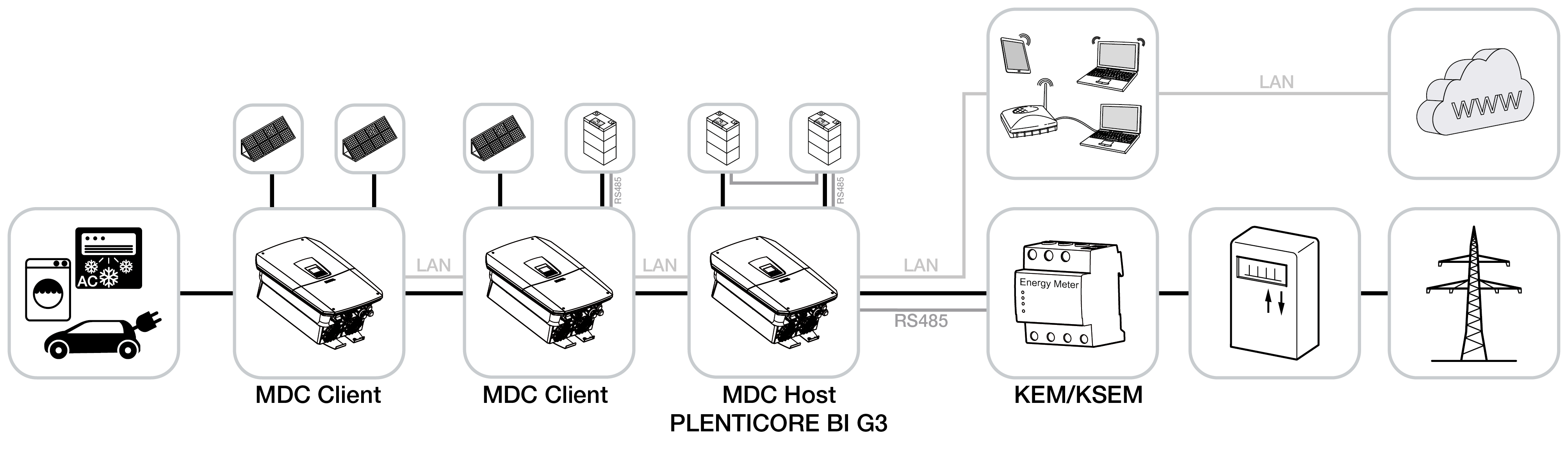 W tym wariancie falownik z największym akumulatorem musi być hostem MDC. W tym przypadku host MDC może przejąć sterowanie maksymalnie 3 falownikami PLENTICORE G3 z podłączonym akumulatorem.
