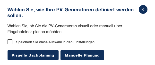 Die PV-Planung kann visuell über Sattelitenbilder oder manuell durch Eingabe der geplanten PV-Generatoren durchgeführt werden. Die Entscheidung zur visuellen oder manuellen PV-Generator Planung können Sie nach dem Verlassen des Verbrauchsdialogs durchführen.