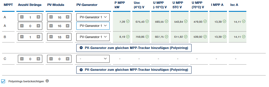 Bei der Verschaltung des Wechselrichters können Sie eine Polystring-Verschaltung berücksichtigen. Mithilfe der Polystring-Verschaltung können unterschiedliche PV-Generatoren mit gleichem PV-Modultyp an denselben MPP-Tracker angeschlossen werden. Hierbei muss die Modulanzahl des PV-Modultyps in den Strängen identisch sein.