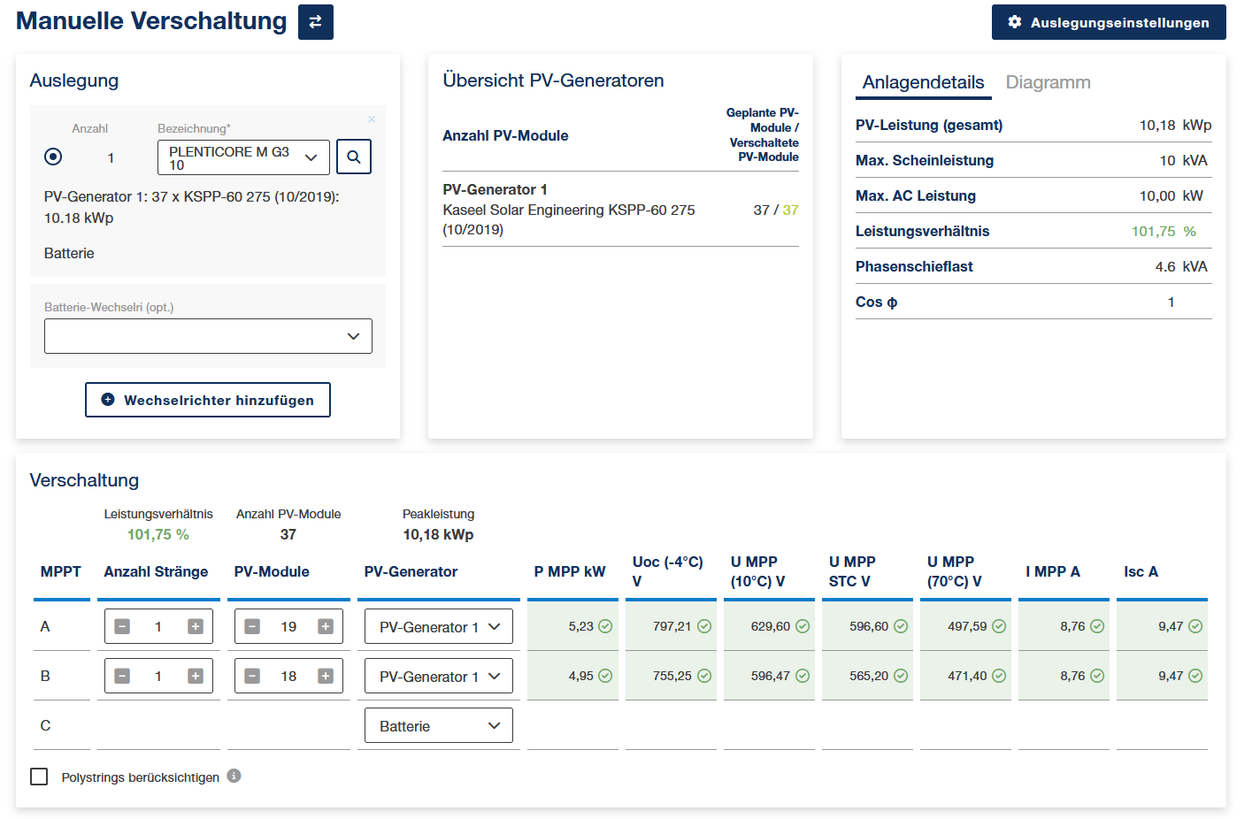 Auslegungseinstellungen Wechselrichter / PV-Generatoren