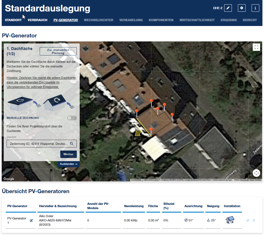 Über die visuelle PV-Generatorplanung können direkt die PV-Generatoren auf Ihrem Dach geplant werden.