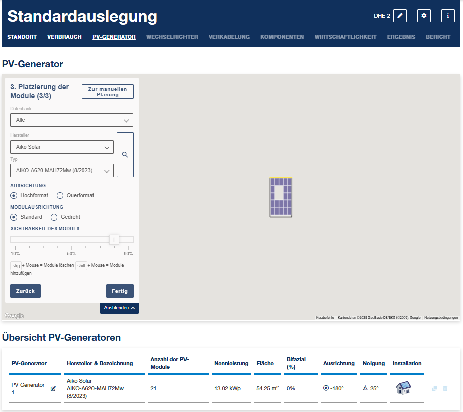 Einzelne Module können durch Klick auf das Modul entfernt oder wieder hinzugefügt werden. - Der PV-Generatoren wird auf dem Dach angezeigt.