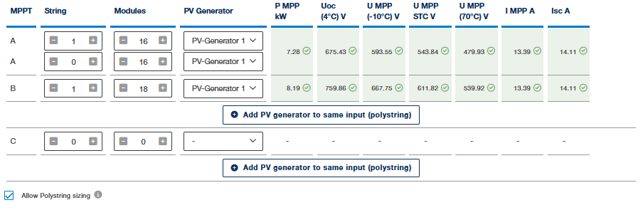 - Connect the inverter with the PV modules that have already been planned. If a connection is outside of the inverter specifications, a notice, warning or error will be displayed.