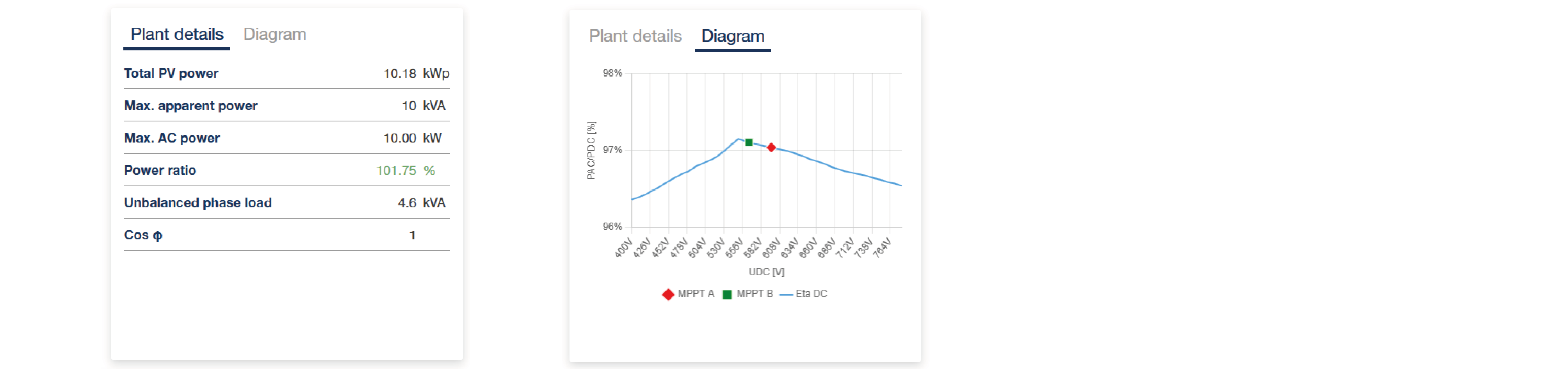Inverter | Power ratio min./max. | Usually, inverters are sized smaller than the total generator power. Adopt the standard value or enter your own value here (20–200, standard values min. 80/max. 120). |