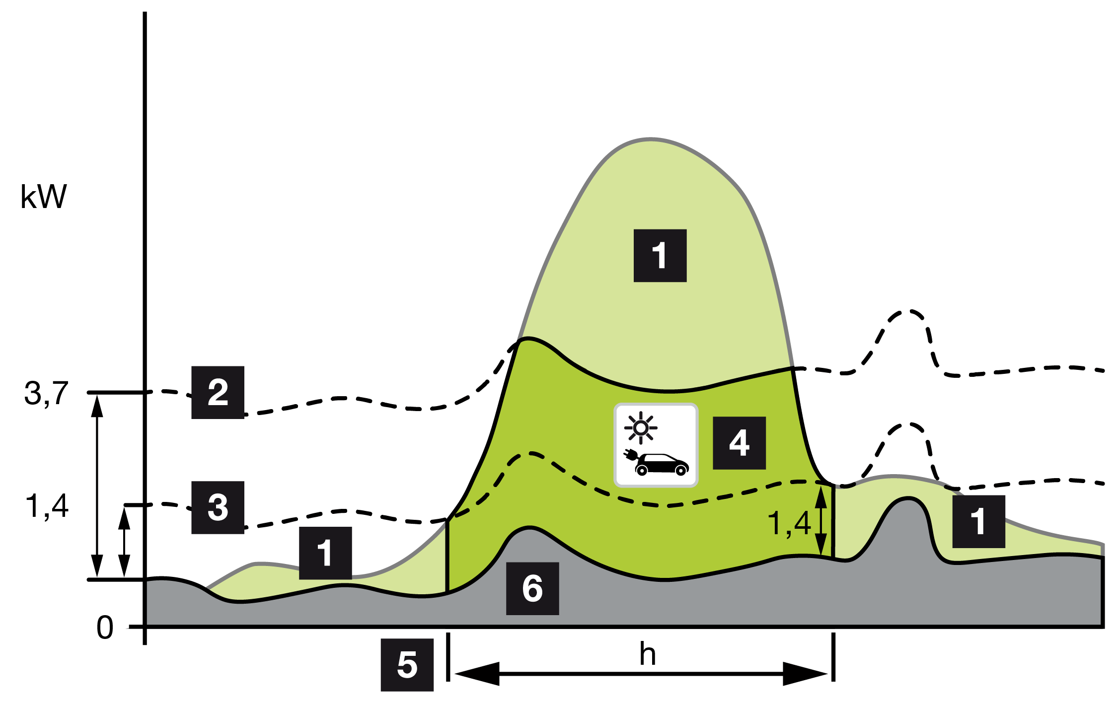 Per i veicoli elettrici che vengono ricaricati in monofase, la potenza di carica è compresa tra 1,4 e 3,7 kW. Questo significa che la ricarica viene avviata solo quando sono disponibili almeno 1,4 kW di energia fotovoltaica in eccesso e viene interrotta o terminata quando questa scende sotto 1,4 kW.