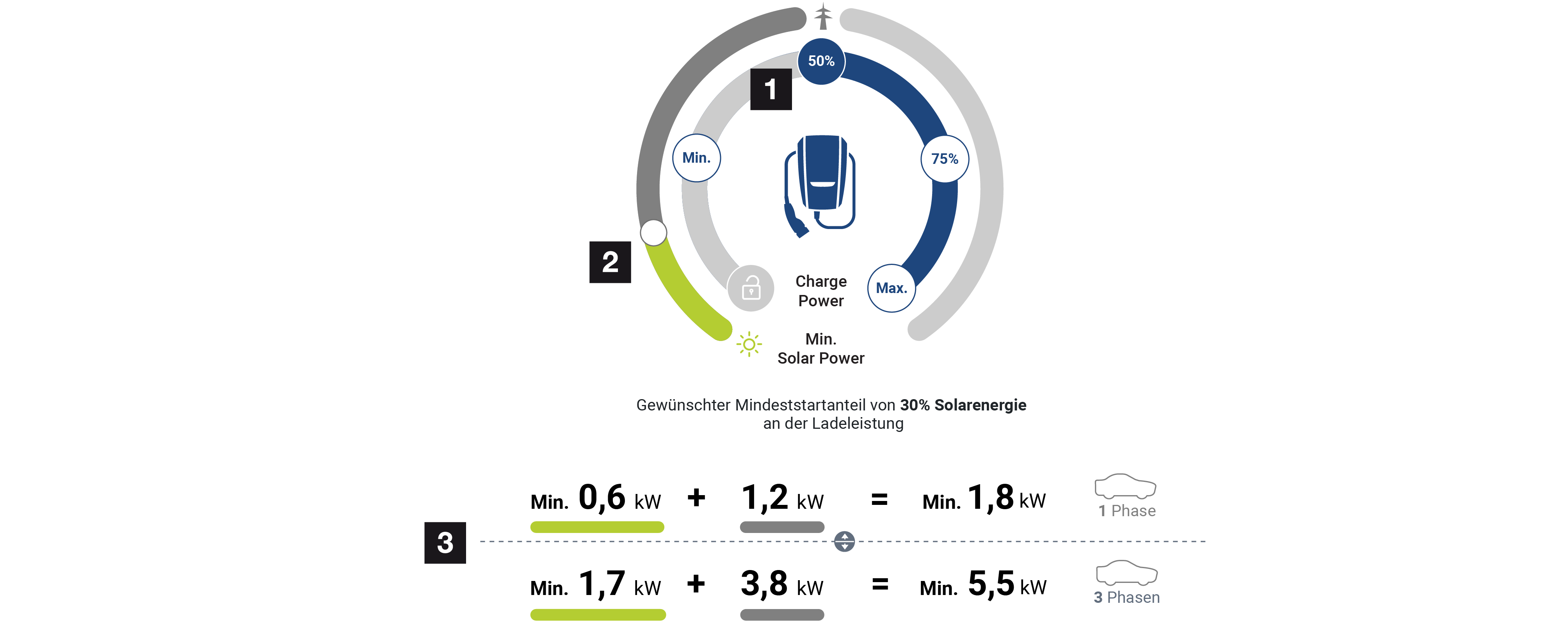 Die Darstellung unten gibt die Einstellung in kW für 1 oder 3-phasige Fahrzeuge wieder. Wird mehr Solarenergie erzeugt als min. eingestellt, wird der Netzbezug um den entsprechenden Anteil verringert.