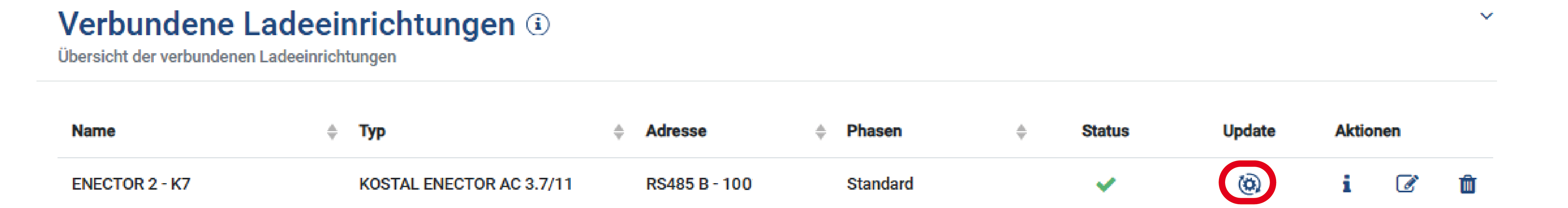 - Rufen Sie den Menüpunkt Wallbox > Einstellungen (Zahnrad) > Verbundene Ladeeinrichtungen > Firmware Update auf.