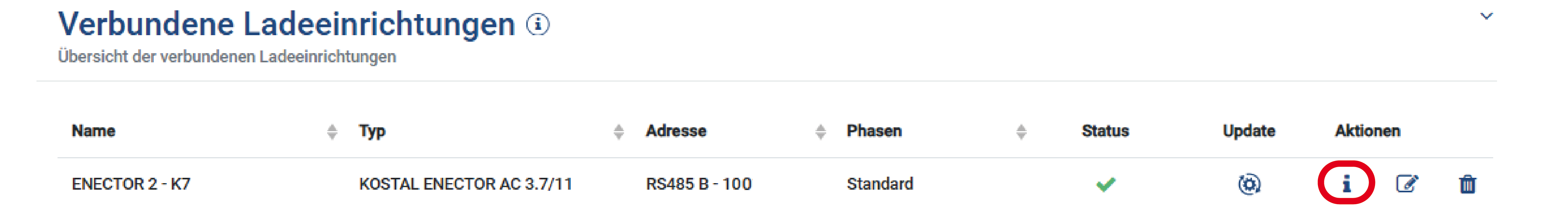 - Die Wallbox muss die Modbus-Version 1.1 unterstützen (ab Wallbox-FW: 2021.50.9128-202). Die FW-Version kann unter dem Menüpunkt Wallbox > Einstellungen (Zahnrad) > Verbundene Ladeeinrichtungen > i (steht für Details) abgefragt werden.