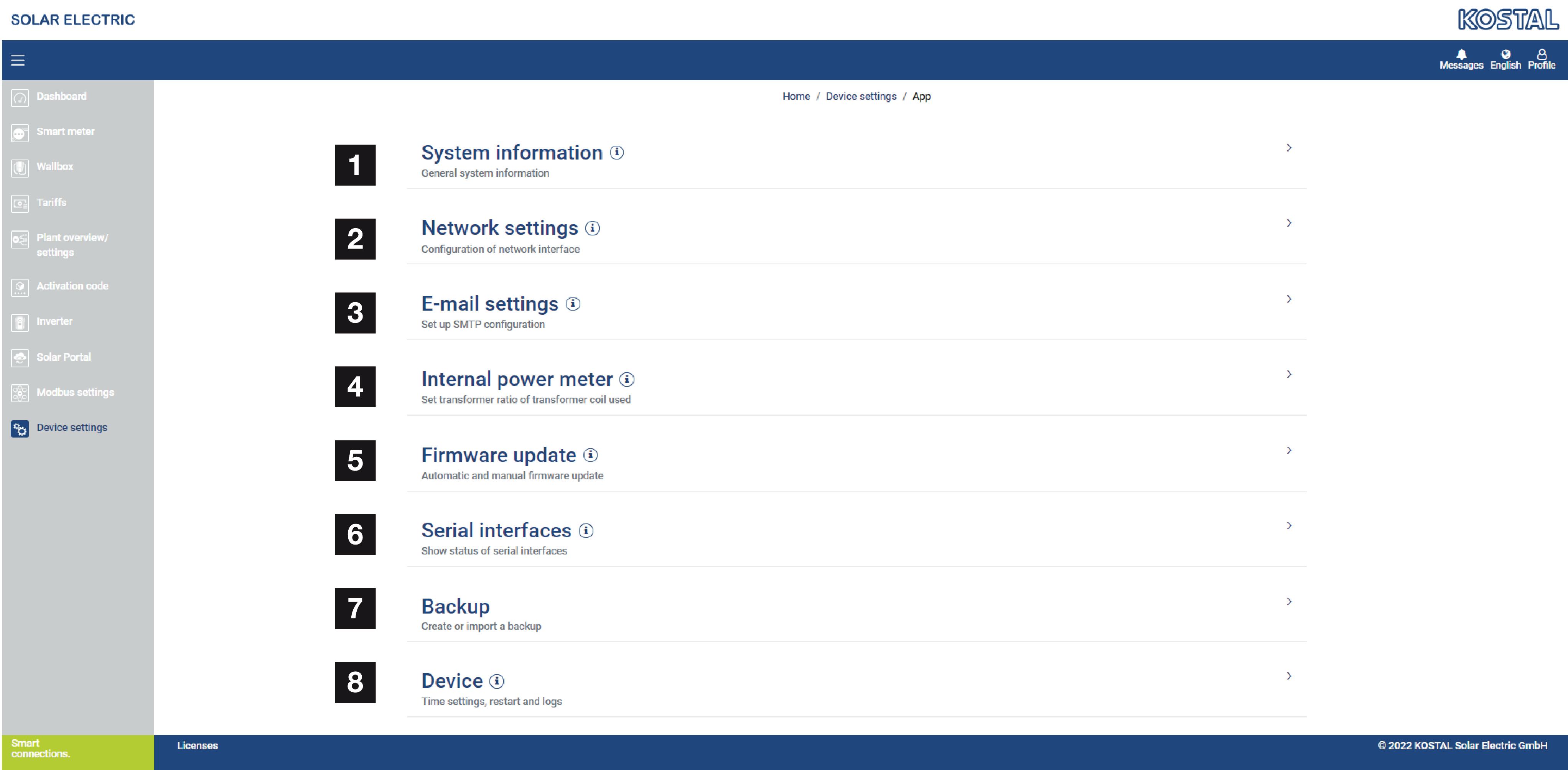 8 | Skirtuke „Įrenginys“ galima nustatyti laiko parametrus, atlikti perkrovimą arba peržiūrėti sistemos žurnalus. |