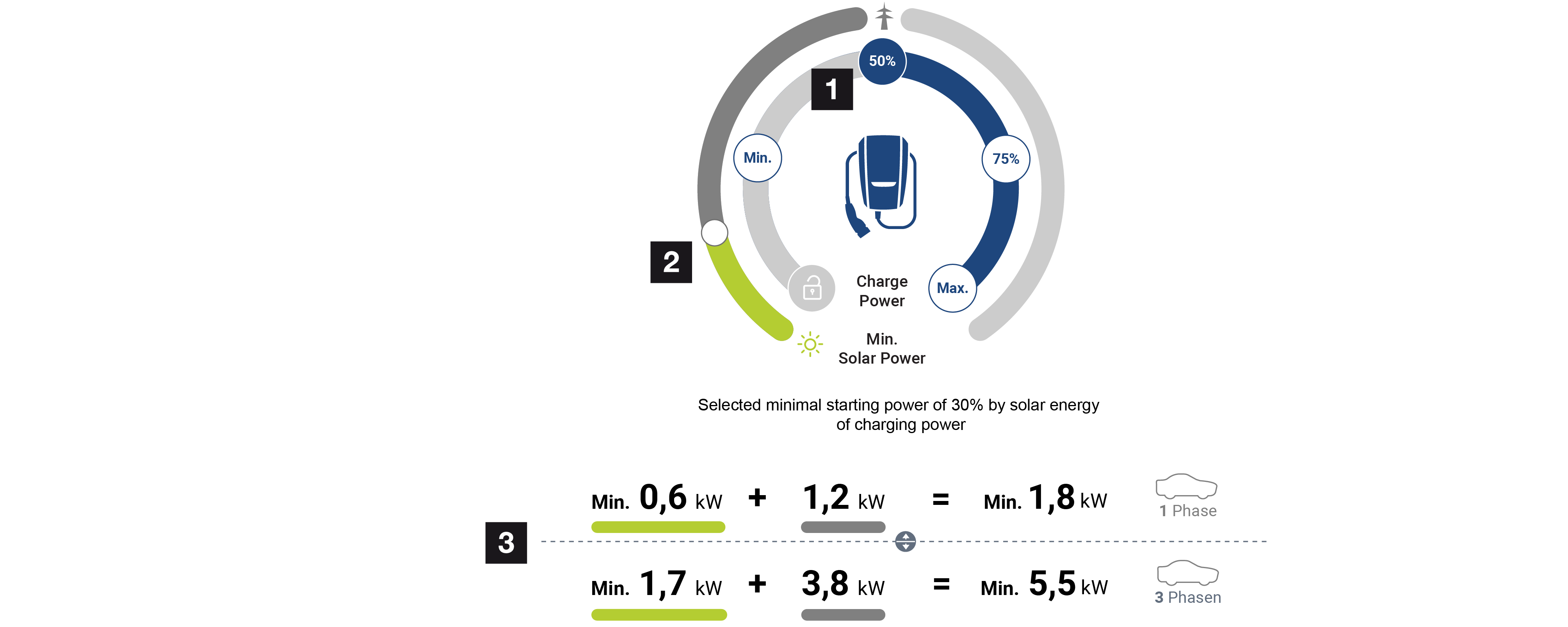 Žemiau pateiktame paveikslėlyje parodyti 1 arba 3 fazių transporto priemonių nustatymai kW. Jei pagaminama daugiau saulės energijos nei nustatyta minimali vertė, energijos tiekimas iš tinklo sumažinamas atitinkama dalimi.