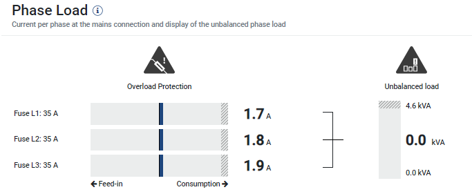 Fazės apkrova rodo esamą apkrovą kiekvienai fazei tinklo prijungimo taške ir fazių asimetrinę apkrovą įkrovimo proceso metu.
