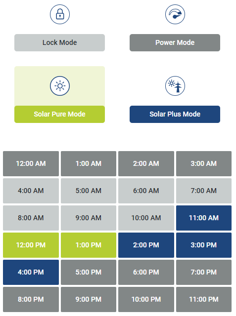 Ja automašīna naktī ir jāuzlādē ar mazāku jaudu (Solar Plus Mode) vai ar pilnu uzlādes jaudu (Power Mode), to arī var ieplānot.