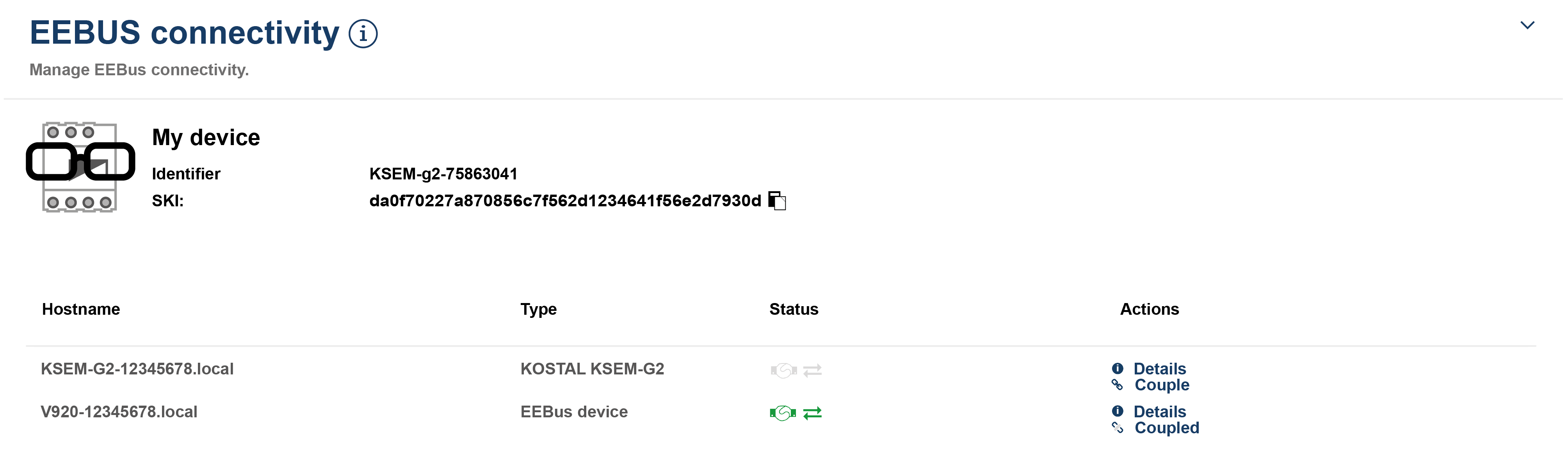 SKI (Subject Key Identifier) ir unikāls identifikators jūsu EEBus ierīcei. To var pieprasīt citas ierīces ar EEBus savienošanas procesā, lai identificētu EEBus ierīci. Šādā gadījumā SKI var kopēt uz starpliktuvi, izmantojot kopēšanas simbolu.