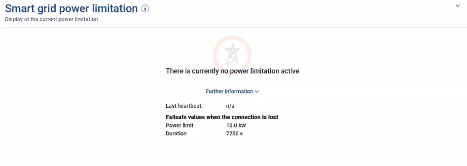 Smarter Grid jaudas ierobežojums parāda pašreizējo jaudas ierobežojumu (ja tas ir aktīvs), ko pēdējo reizi ir noteicis tīkla operators. Papildus jaudas ierobežojumam tiek parādīts arī tā derīguma termiņš.