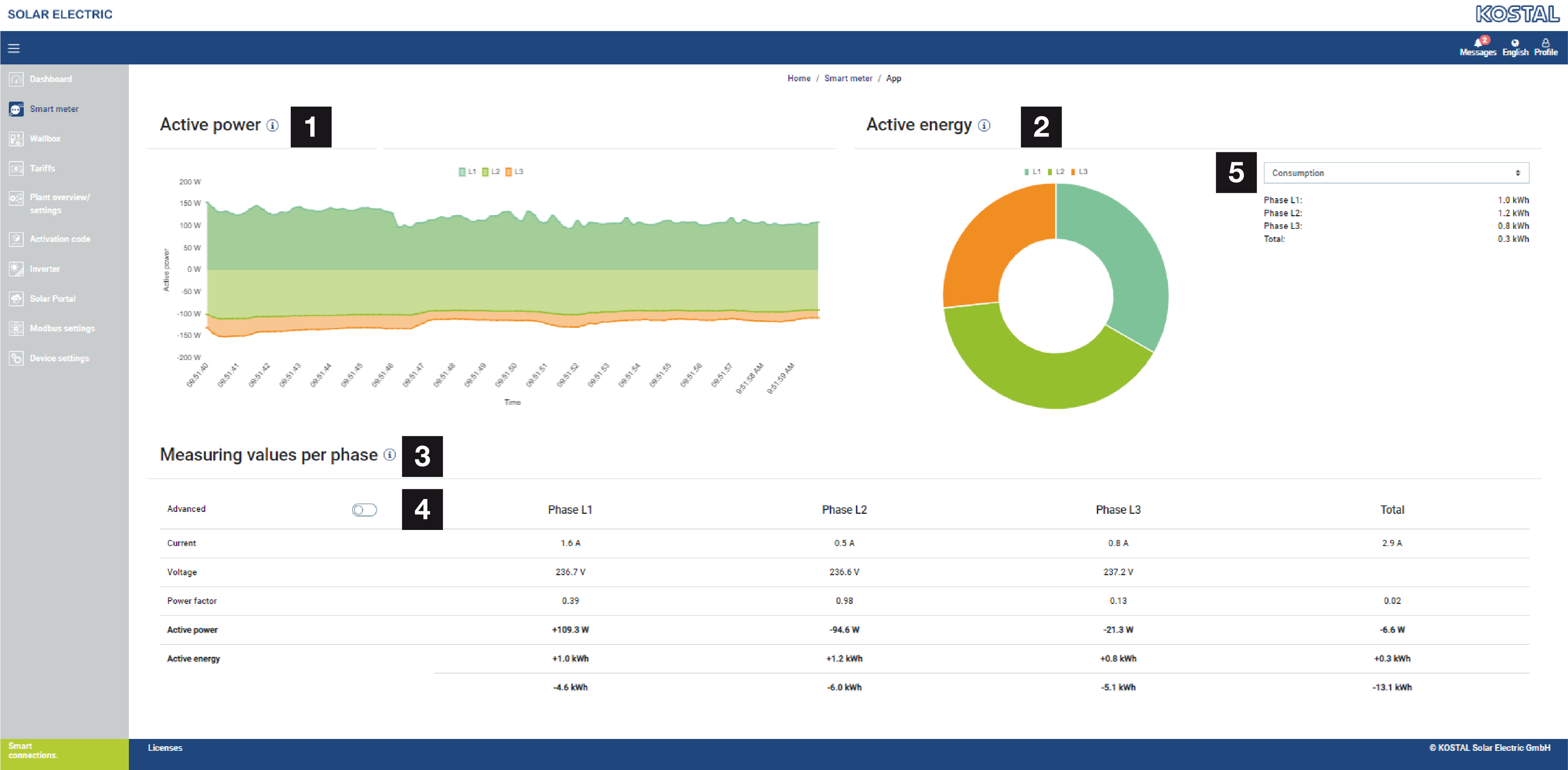 Diagramma un tabula parāda visas sistēmas jaudas vērtības katrai fāzei kā patēriņa vai piegādes summu. Aktīvā enerģija ir jauda, kas tiek sniegta noteiktā laika periodā. Tā tiek izteikta vatos stundās.