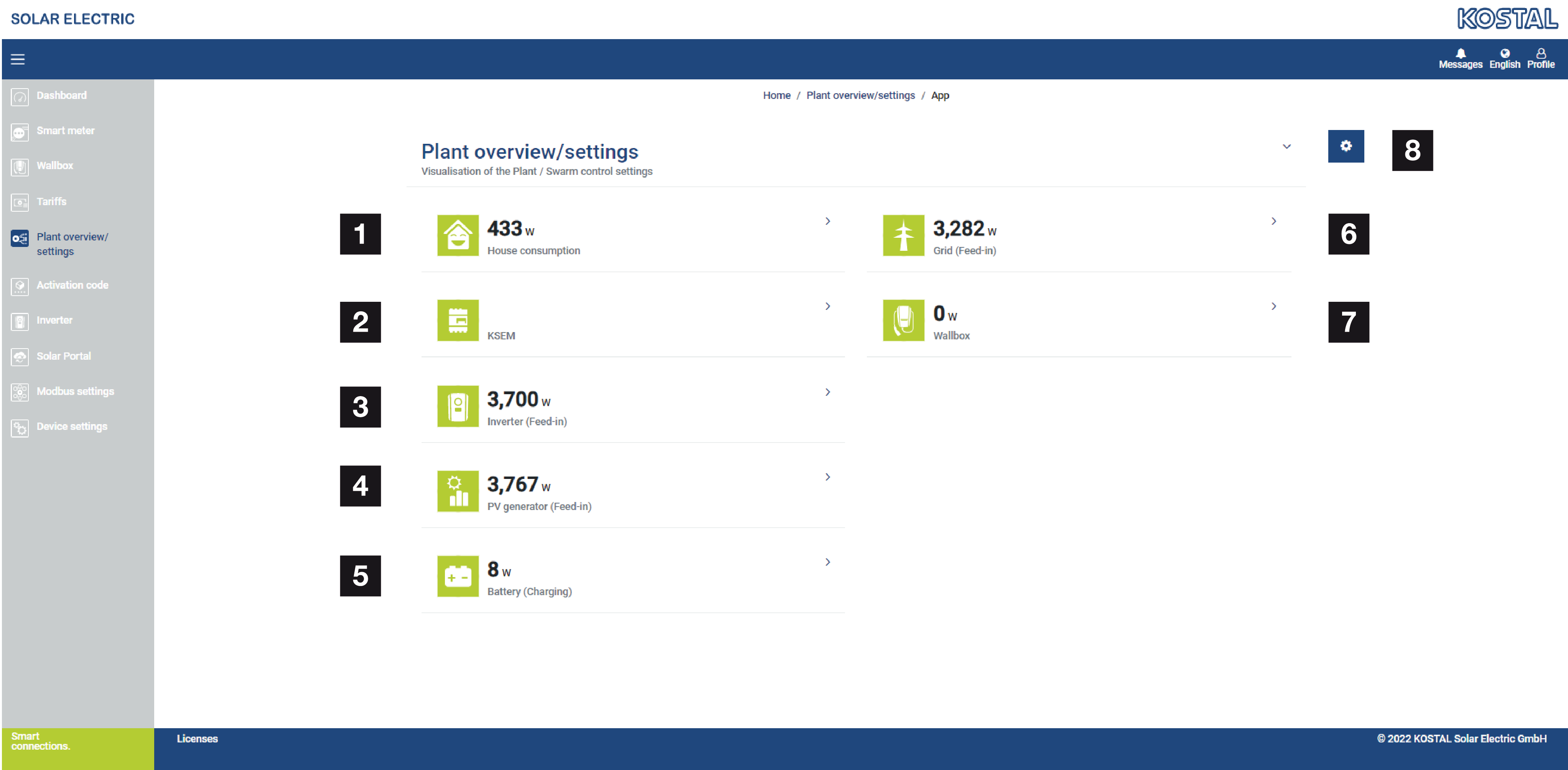 Izmantojot dažādas statistikas, lietotājs var apskatīt aktuālos rādītājus par mājas patēriņu, KOSTAL Smart Energy Meter, invertoriem, tīkla patēriņu un Wallbox. Detalizētu informāciju var apskatīt, atverot attiecīgo statistiku.
