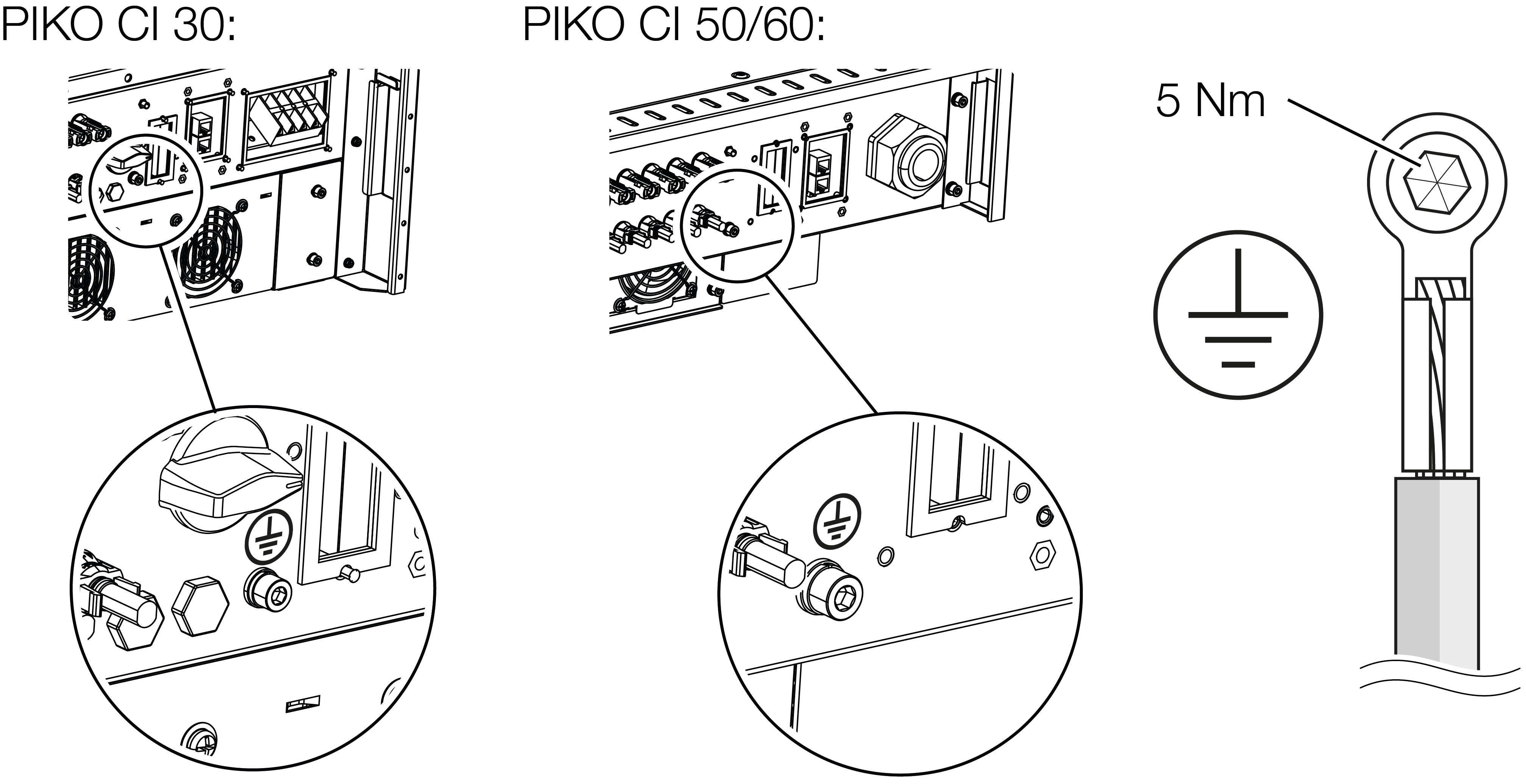 - In Ländern, in denen ein zweiter PE-Anschluss vorgeschrieben ist, diesen an der gekennzeichneten Stelle des Gehäuses (außen) anschließen.