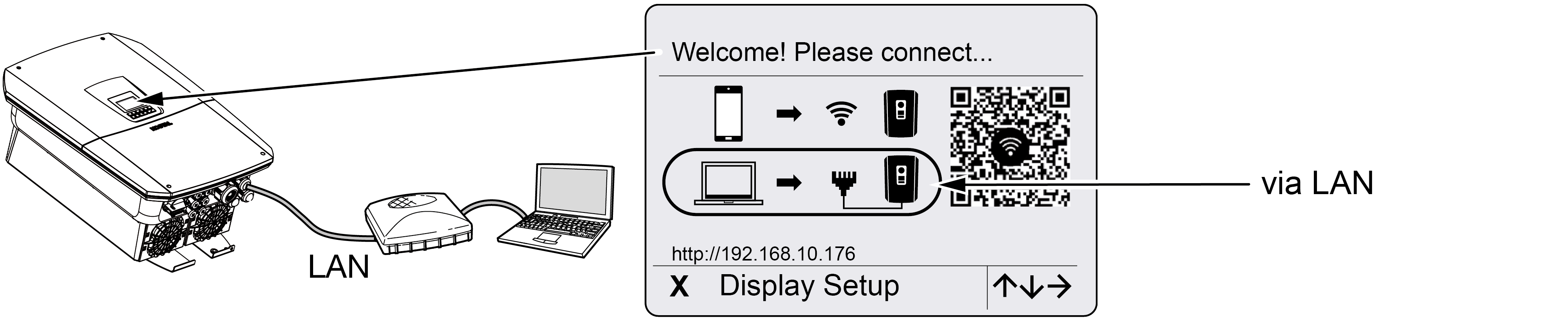 Die Erstinbetriebnahme über den Webbrowser kann über den WLAN-Access-Point des Wechselrichters oder eine LAN-Verbindung durchgeführt werden.