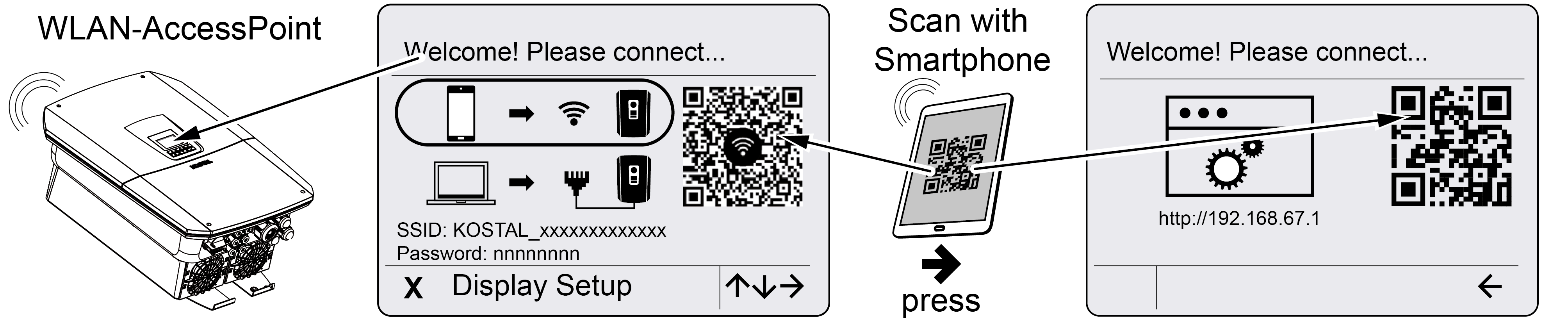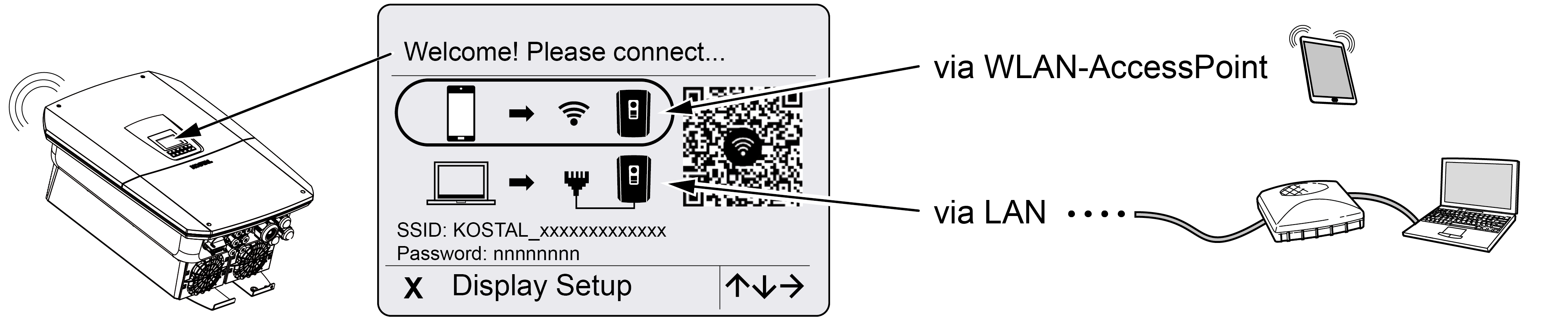 - Scannen Sie den QR-Code mit Ihrem Smartphone ab und verbinden Sie sich mit dem WLAN-Access-Point des Wechselrichters. Wenn das nicht möglich ist, können Sie die Verbindung manuell herstellen. Verwenden Sie dazu die angezeigte SSID (KOSTAL_<Seriennummer-Wechselrichter>) und das Passwort (P<Artikelnummer-Wechselrichter>).