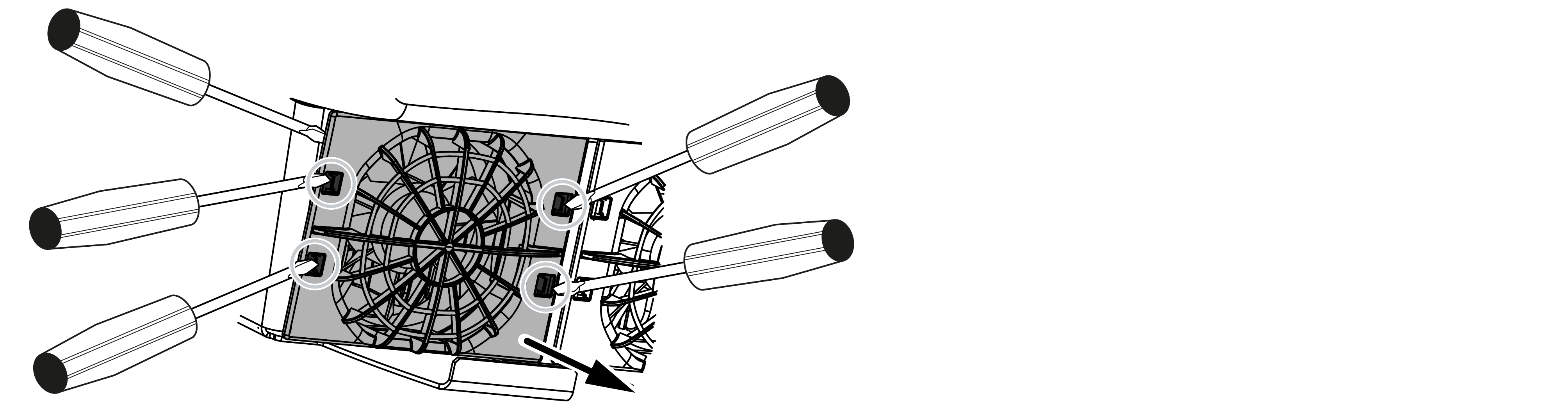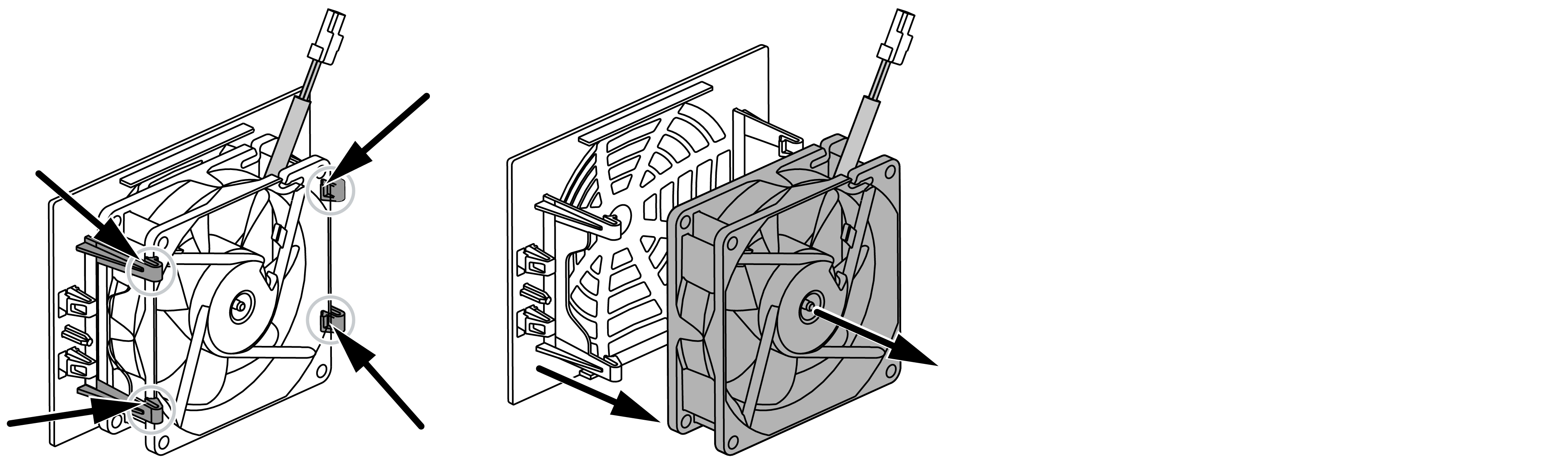 - Der Lüfter kann zusätzlich noch vom Lüftergitter abgezogen werden. Dazu Befestigungslaschen leicht nach außen drücken und Lüfter abziehen.
