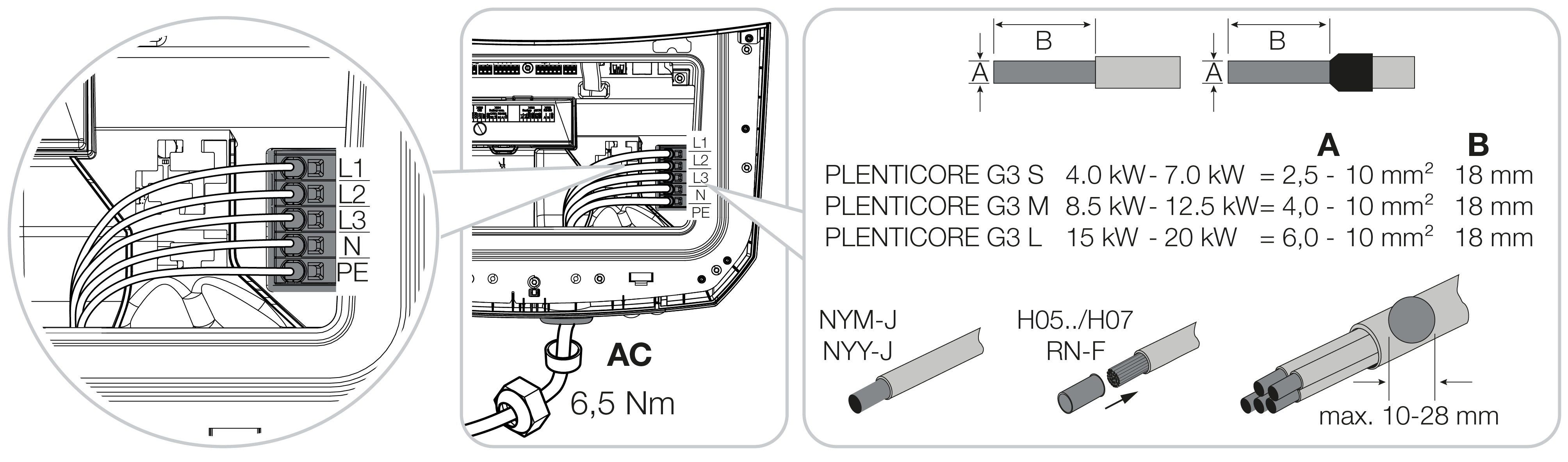 Es können eindrähtige Kabel (Typ NYY-J oder NYM-J) ohne Aderendhülsen mit der AC-Anschlussklemme verwendet werden.