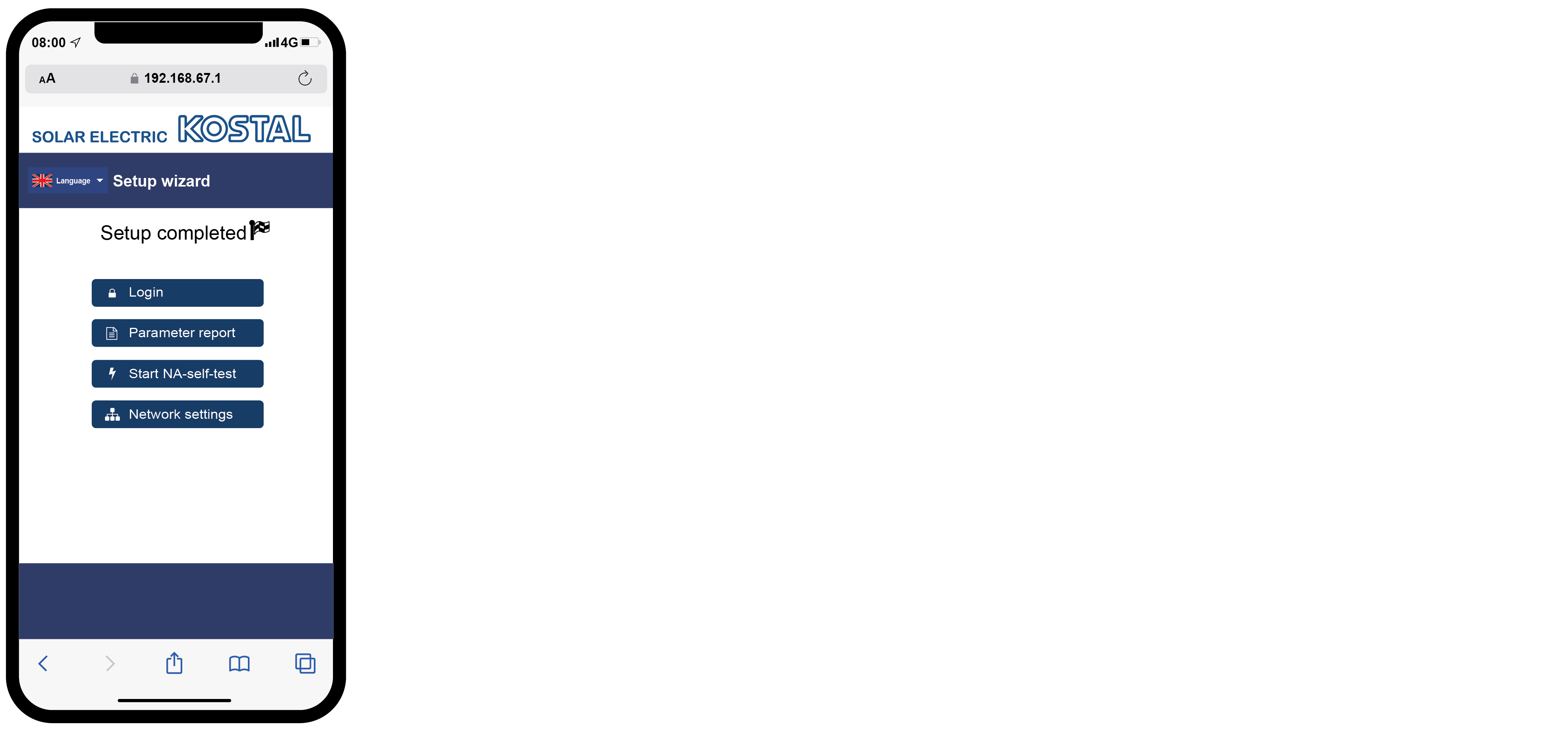 Веднага след като връзката бъде установена, в уеб браузъра на свързаното устройство автоматично се отваря уеб страницата за първоначална настройка на инвертора. Ако това не се случи, въведете ръчно IP адреса на инвертора в браузъра. Адресът се показва на дисплея на инвертора.