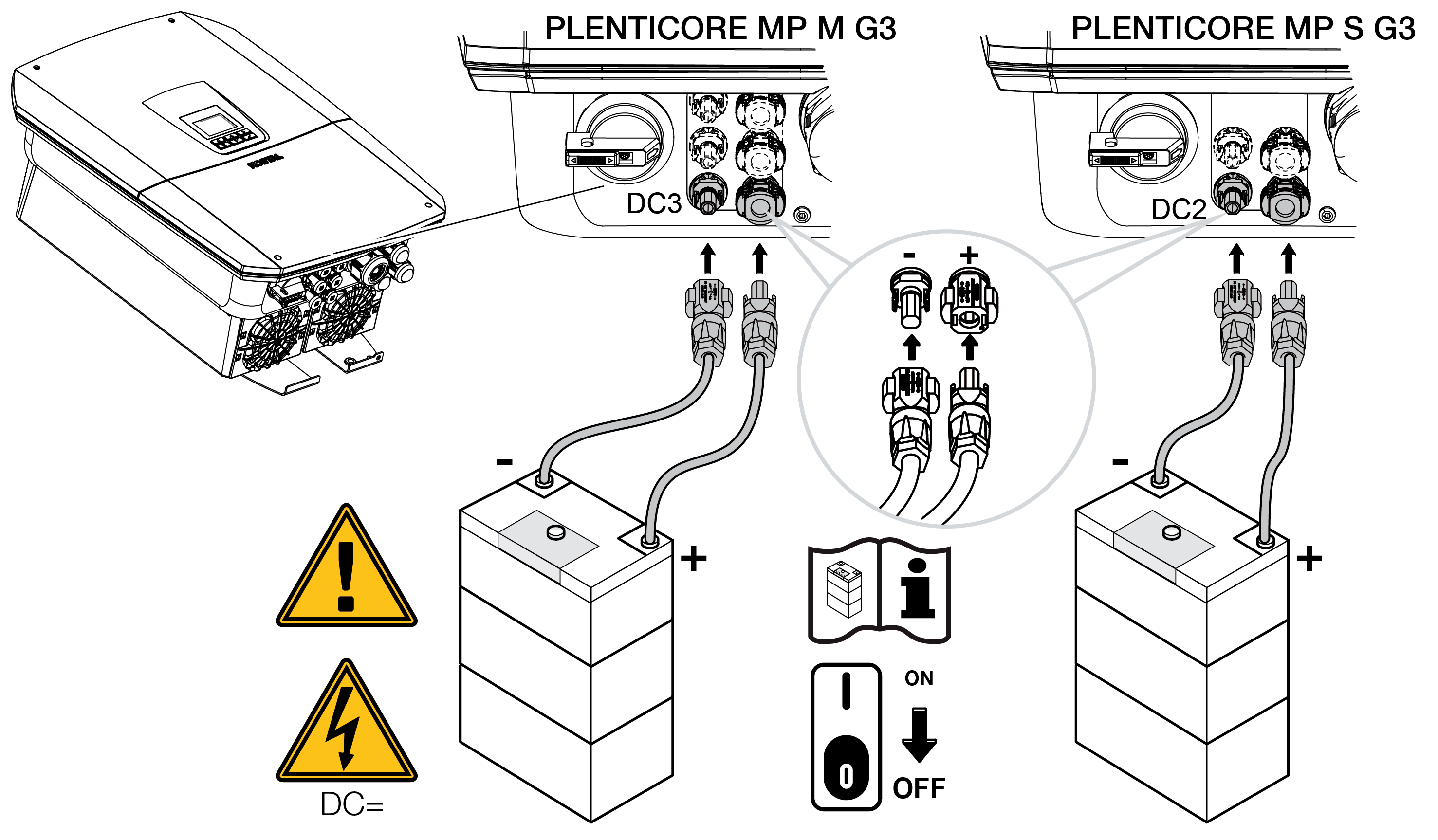 Die DC-Leitungen der Batterie dürfen nur an den Wechselrichter angeschlossen werden, wenn der Wechselrichter sowie der Batteriespeicher spannungsfrei sind.