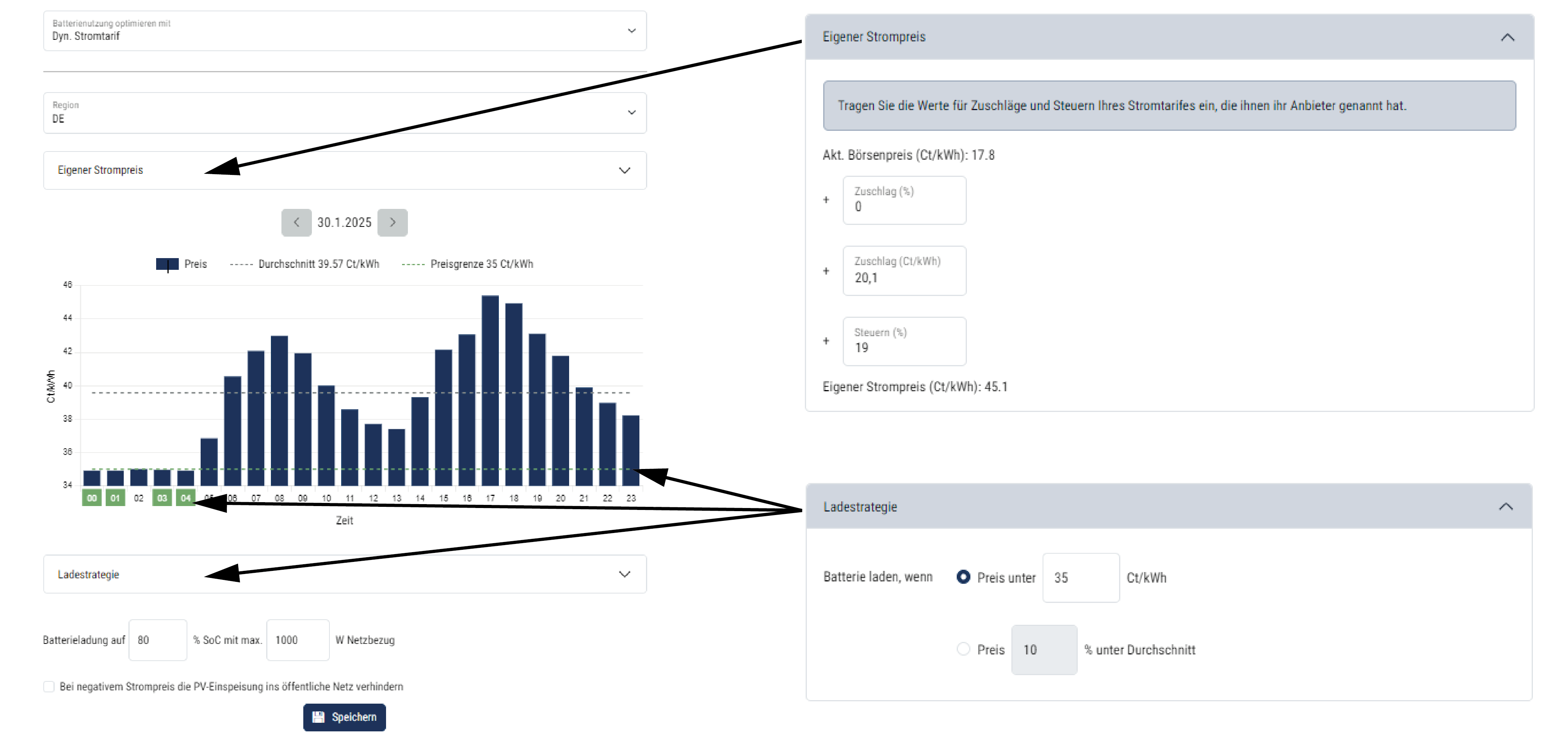 Region: Eigener Strompreis: Grafische Darstellung Dynamischer Strompreis: Ladestrategie: Batterieladung auf: Bei negativem Strompreis die PV-Einspeisung ins Netz verhindern: |