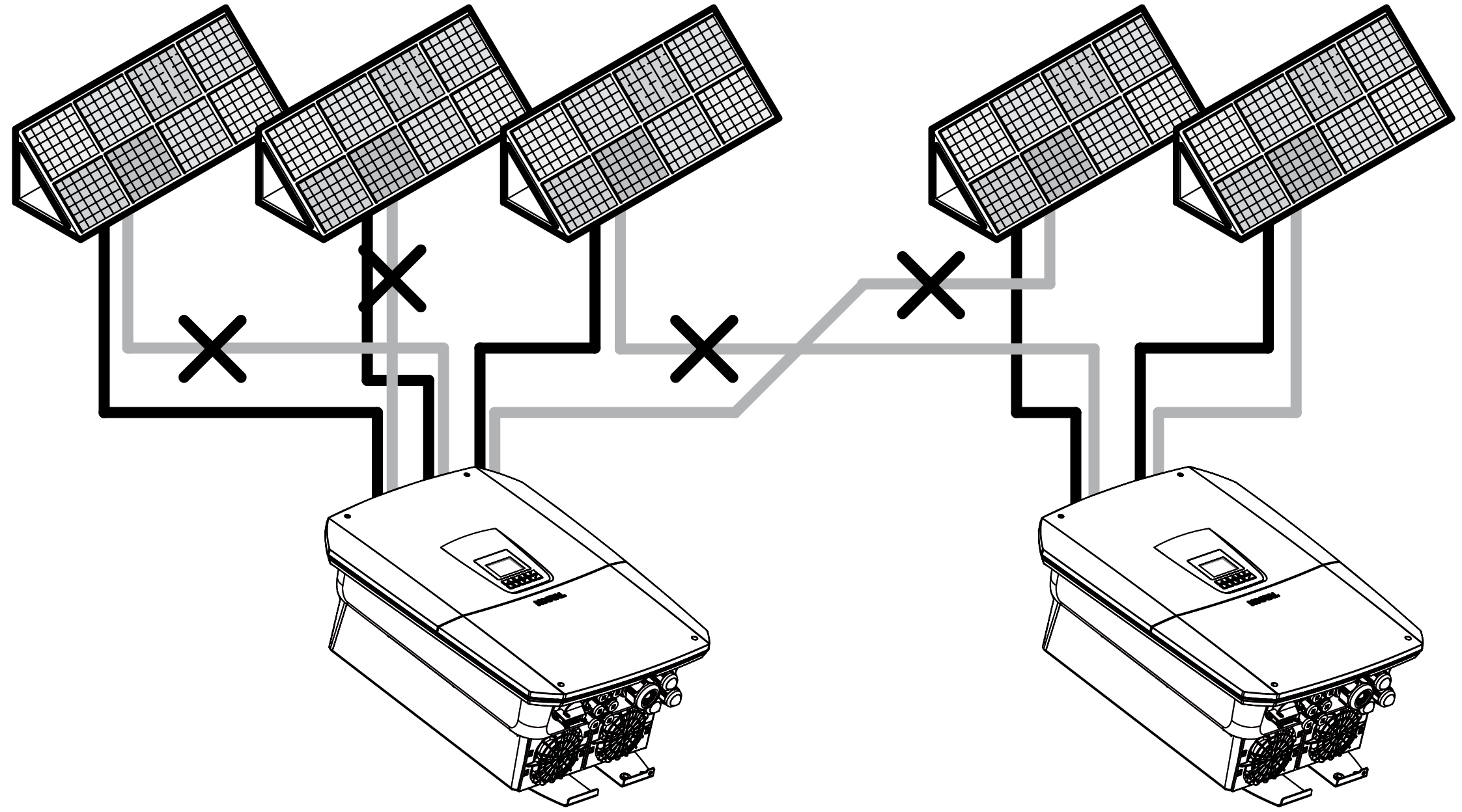 - Bei mehreren Wechselrichtern in einer PV-Anlage darauf achten, dass beim Anschluss der PV-Generatoren keine Kreuzverschaltung entsteht.