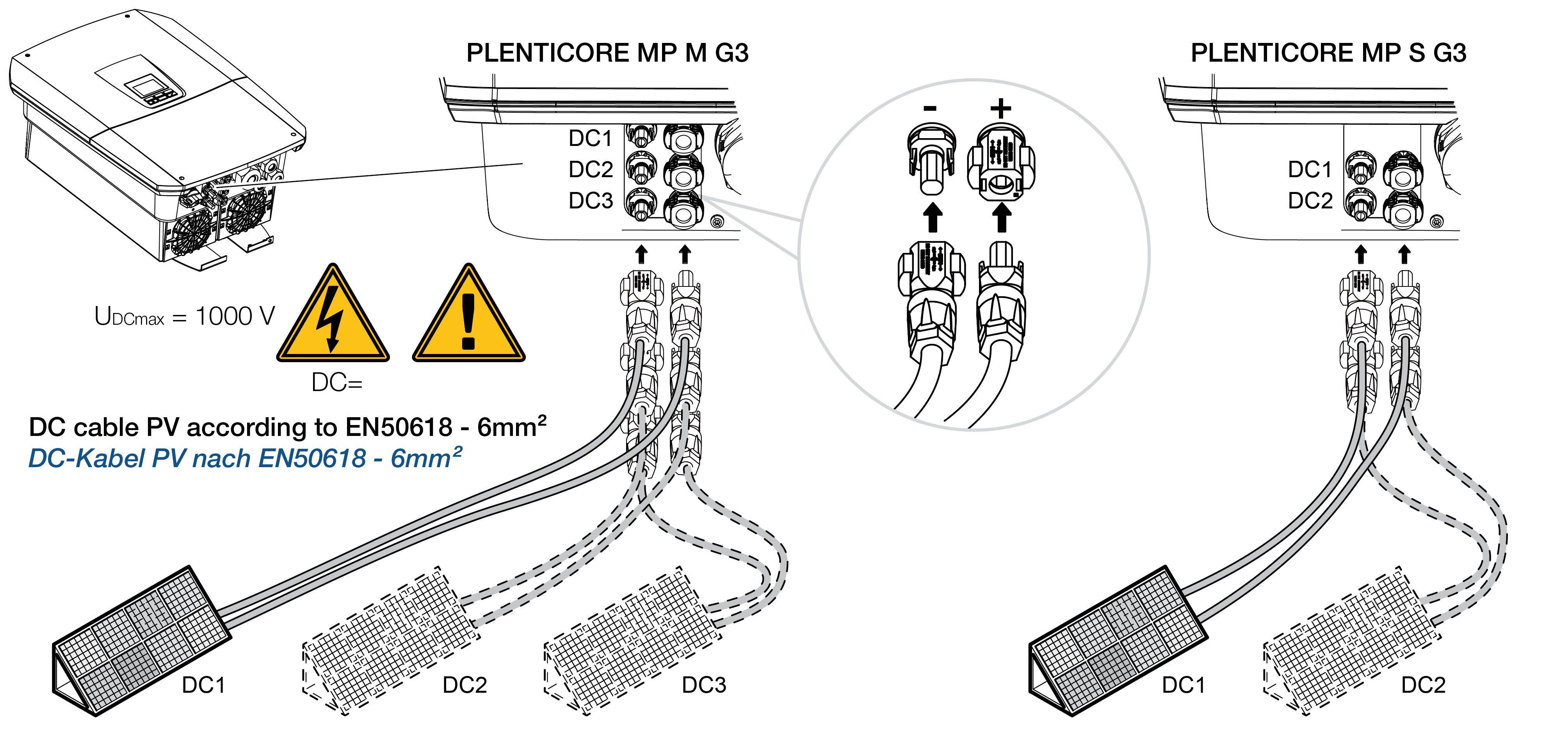 - Die Buchsen und Stecker der DC-Leitungen am Wechselrichter einstecken. Die Dichtstopfen aus den Steckverbindern aufbewahren.