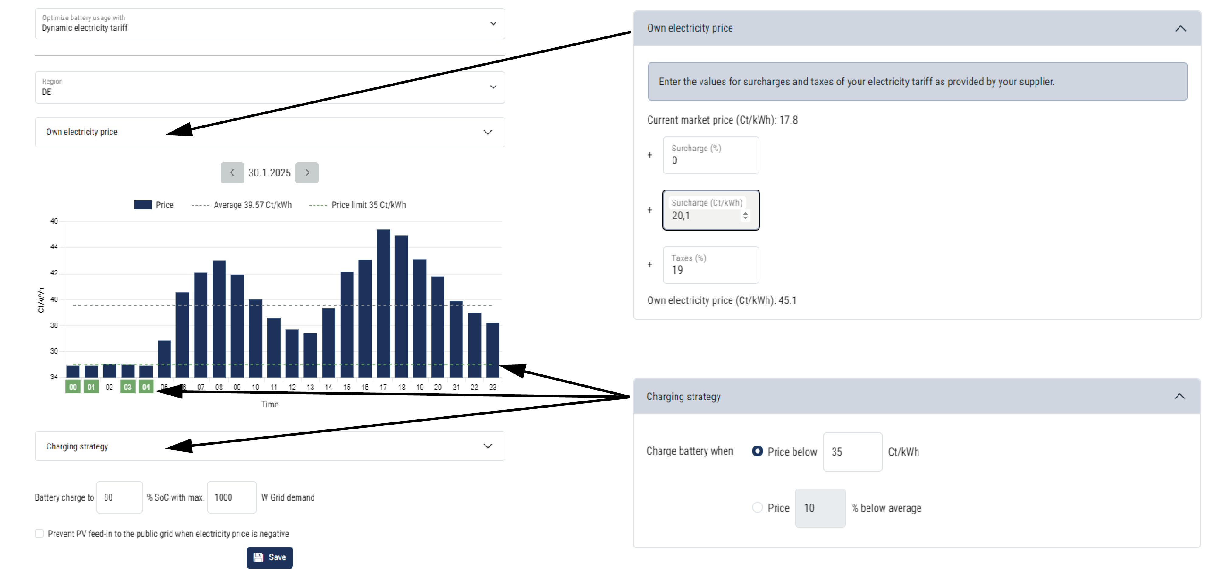 Ако като потребител сте сключили договор с вашия доставчик на енергия за динамична тарифа за електроенергия, чрез инвертора можете много удобно да я използвате за зареждане на батерия, свързана към инвертора, от обществената мрежа.