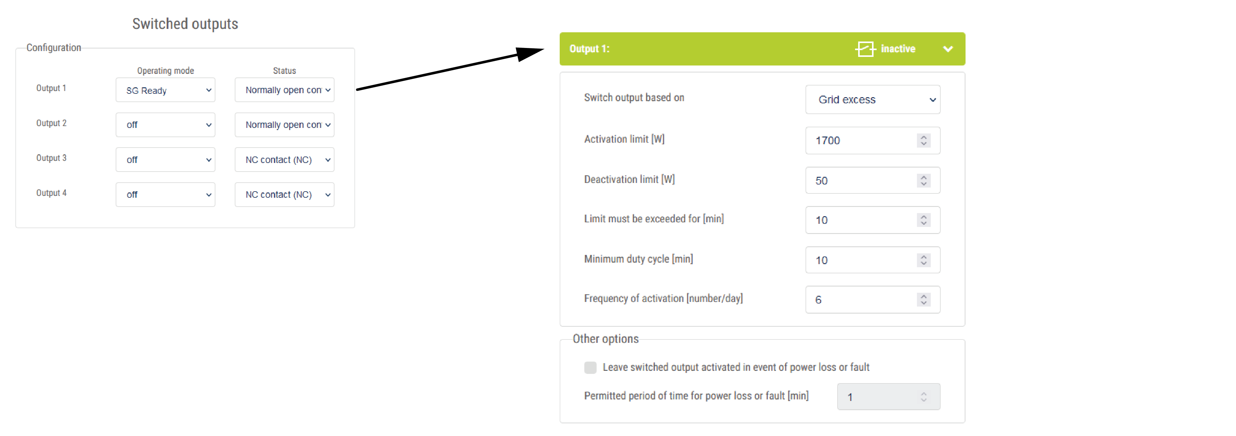 La sortie de commutation n° 1 (OUT1) est utilisée. Celle-ci doit commuter sur la base du surplus de puissance du réseau. Le mode renforcé de la pompe à chaleur (mode 3) nécessite 1700 W selon le fabricant.