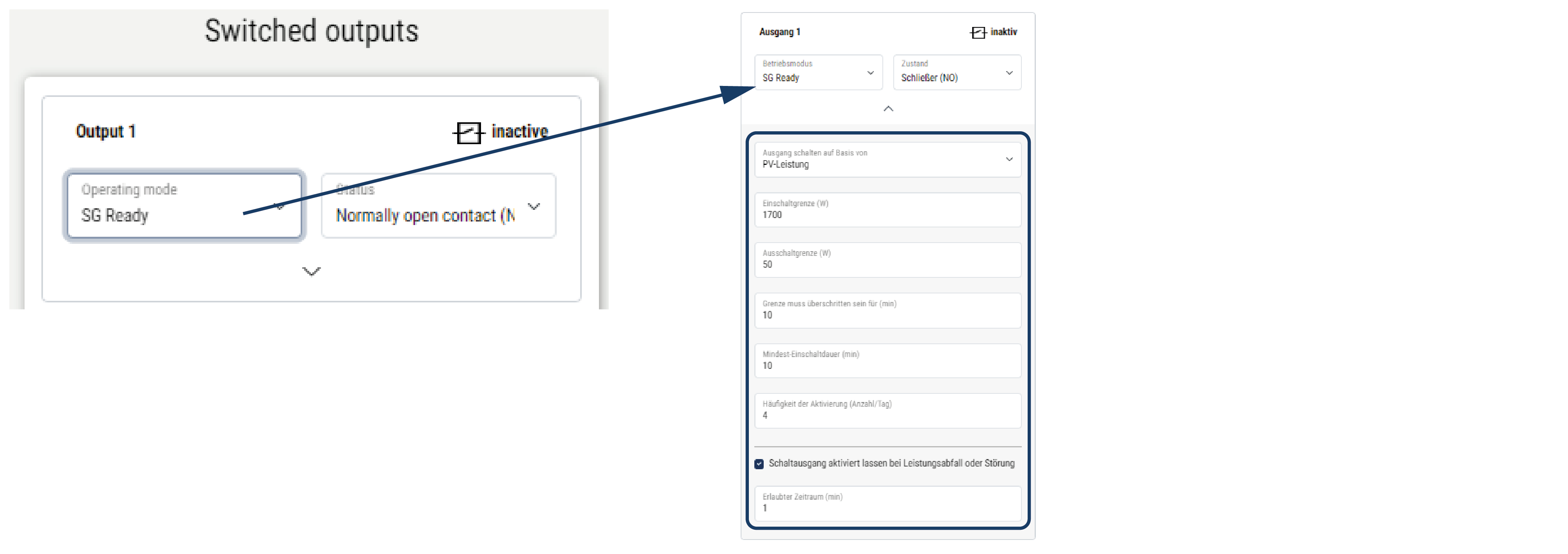 Der Schaltausgang bleibt mindestens so lange aktiv, bis die eingestellte Zeit erreicht wurde. Das verhindert, dass Geräte immer wieder an-/ausgeschaltet werden. Die SG-Ready-Spezifikation gibt vor, dass das Signal mindestens für 10 Minuten aktiv sein muss. Ein kleinerer Wert kann daher nicht eingestellt werden. |