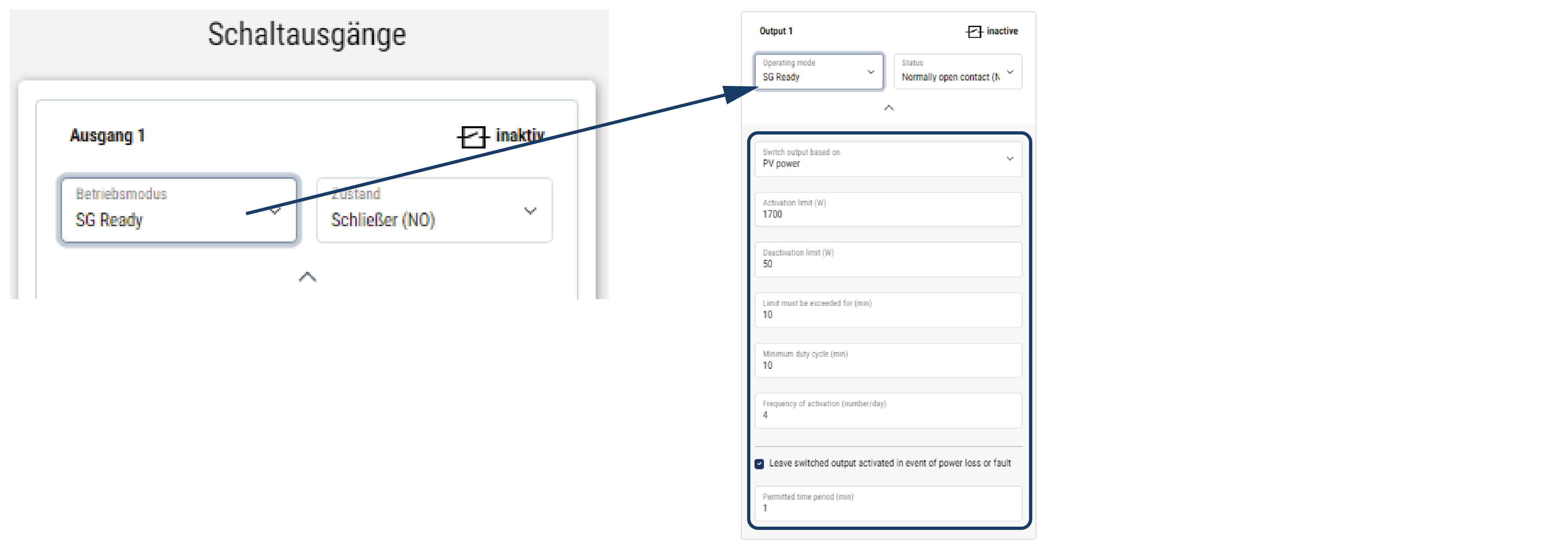 Lülitusväljund jääb vähemalt seniks aktiivseks, kuni seadistatud aeg on saabunud. See takistab, et seadmeid lülitataks tihti sisse/välja. SG-Ready spetsifikatsioon annab ette, et signaal peab olema vähemalt 10 minutit aktiivne. Väiksemat väärtust ei saa seega seadistada. |