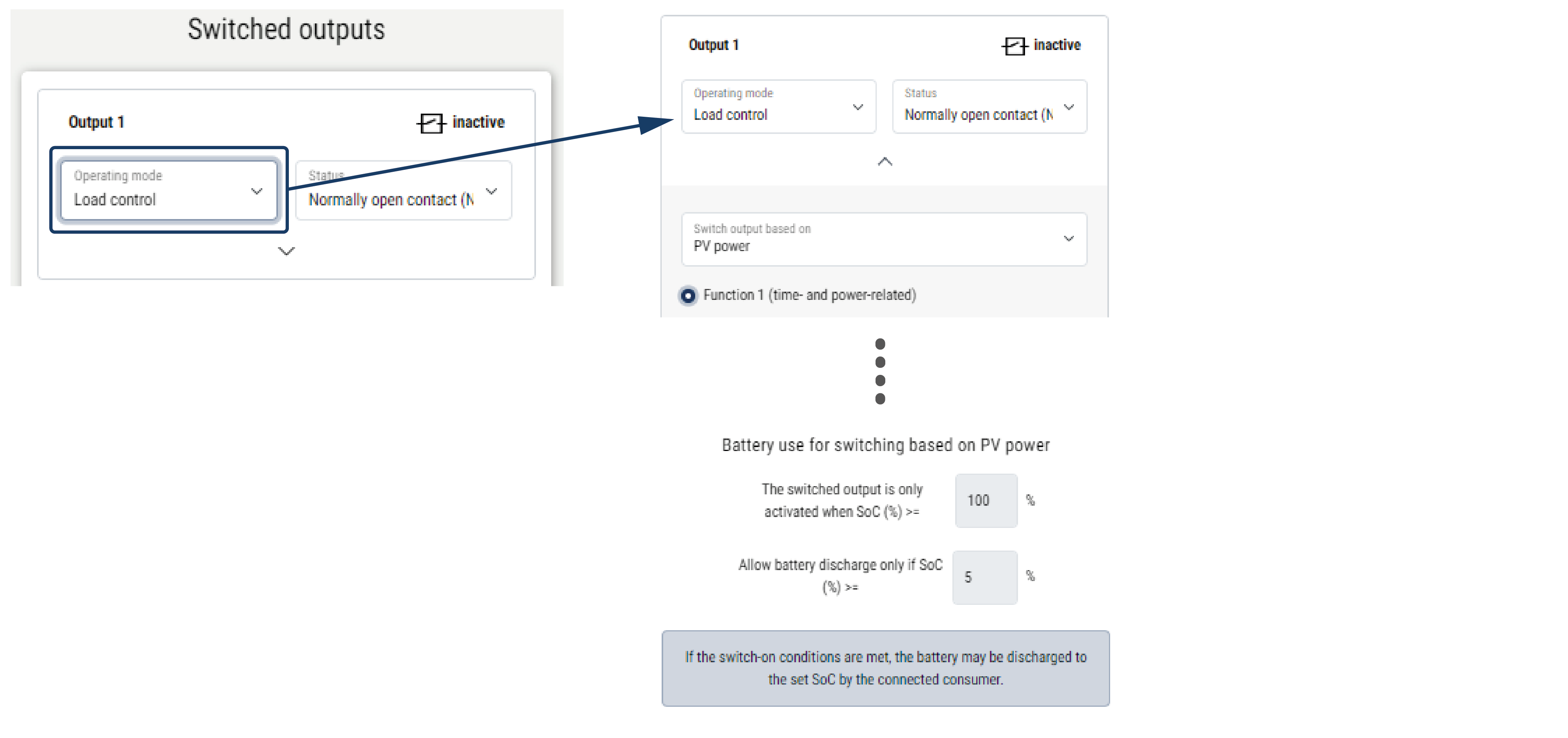 - Selezionare l’uscita, ad es. l’uscita 1 e la modalità di esercizio Controllo del carico.