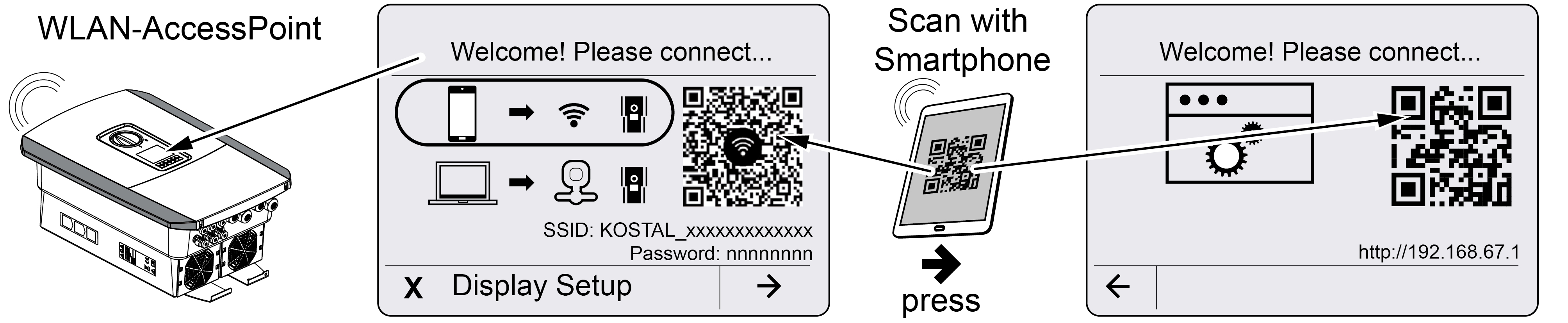 - Zeskanować kod QR za pomocą smartfona i połączyć się z punktem dostępu WLAN falownika. Jeśli nie jest to możliwe, można nawiązać połączenie ręcznie. Użyj wyświetlonego identyfikatora SSID (KOSTAL_<numer seryjny falownika>) i hasła (P<numer katalogowy falownika>).