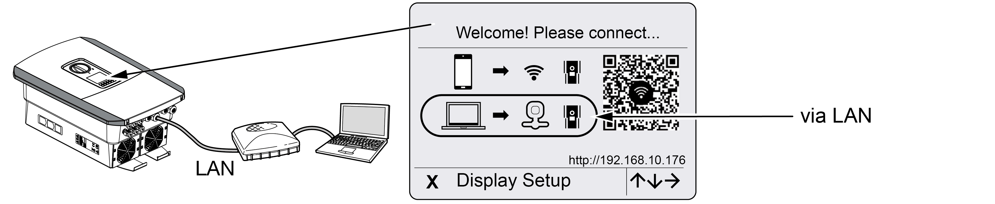 Pierwsze uruchomienie za pomocą przeglądarki internetowej można przeprowadzić poprzez punkt dostępu WLAN falownika lub połączenie LAN.