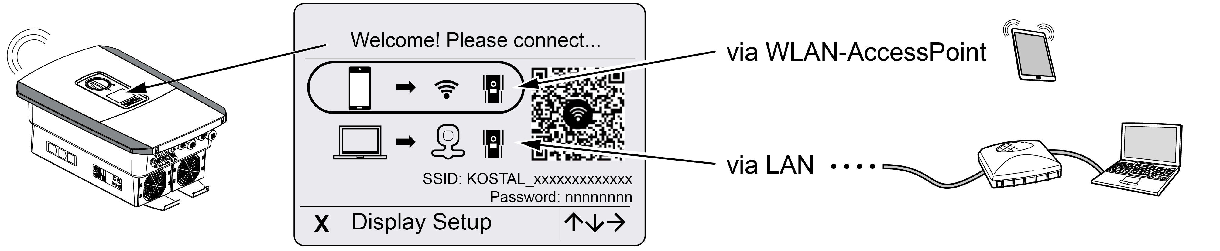 - Konfiguracja przy użyciu aplikacji KOSTAL Solar App jest przeprowadzana za pomocą punktu dostępu WLAN falownika.