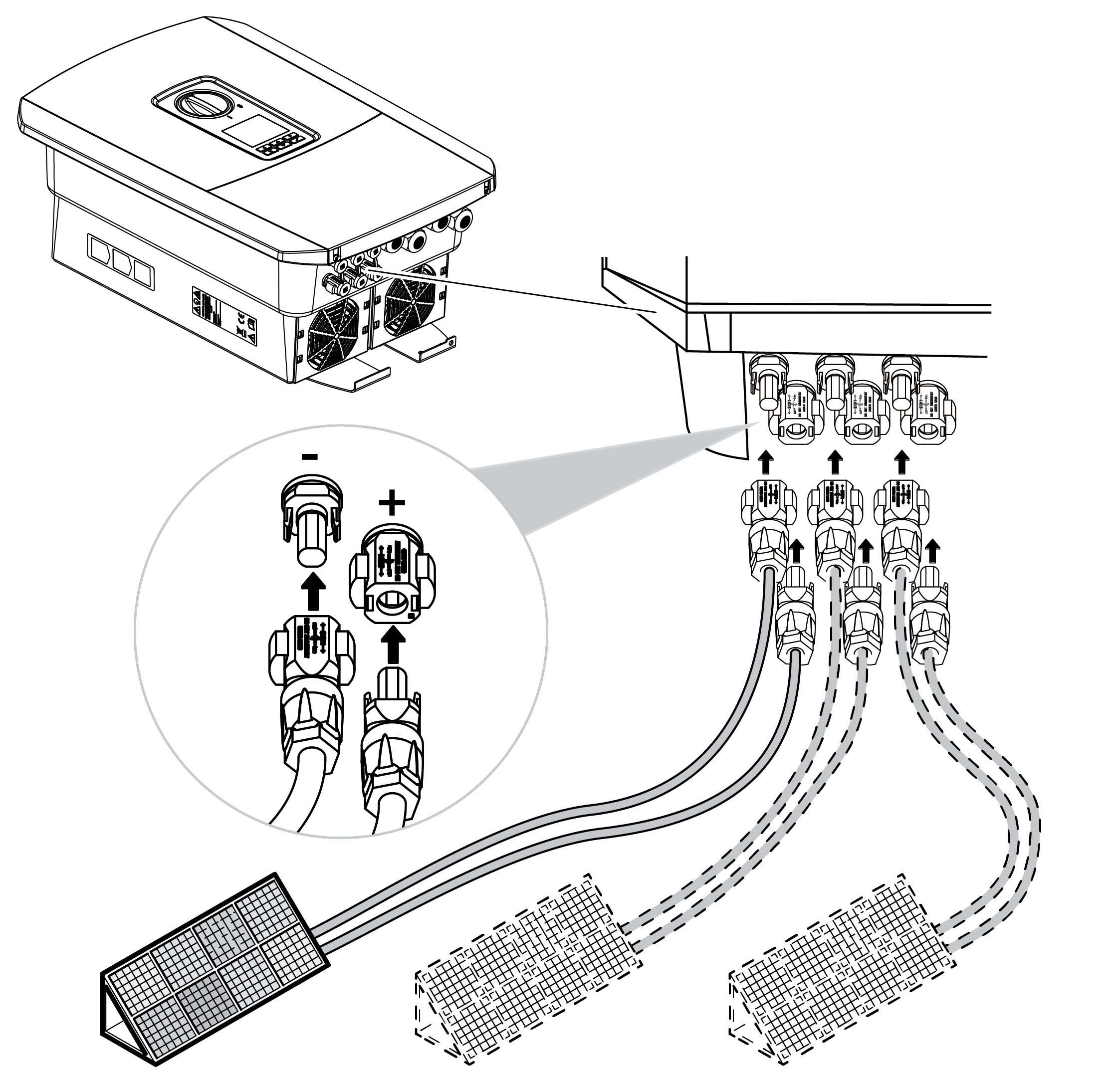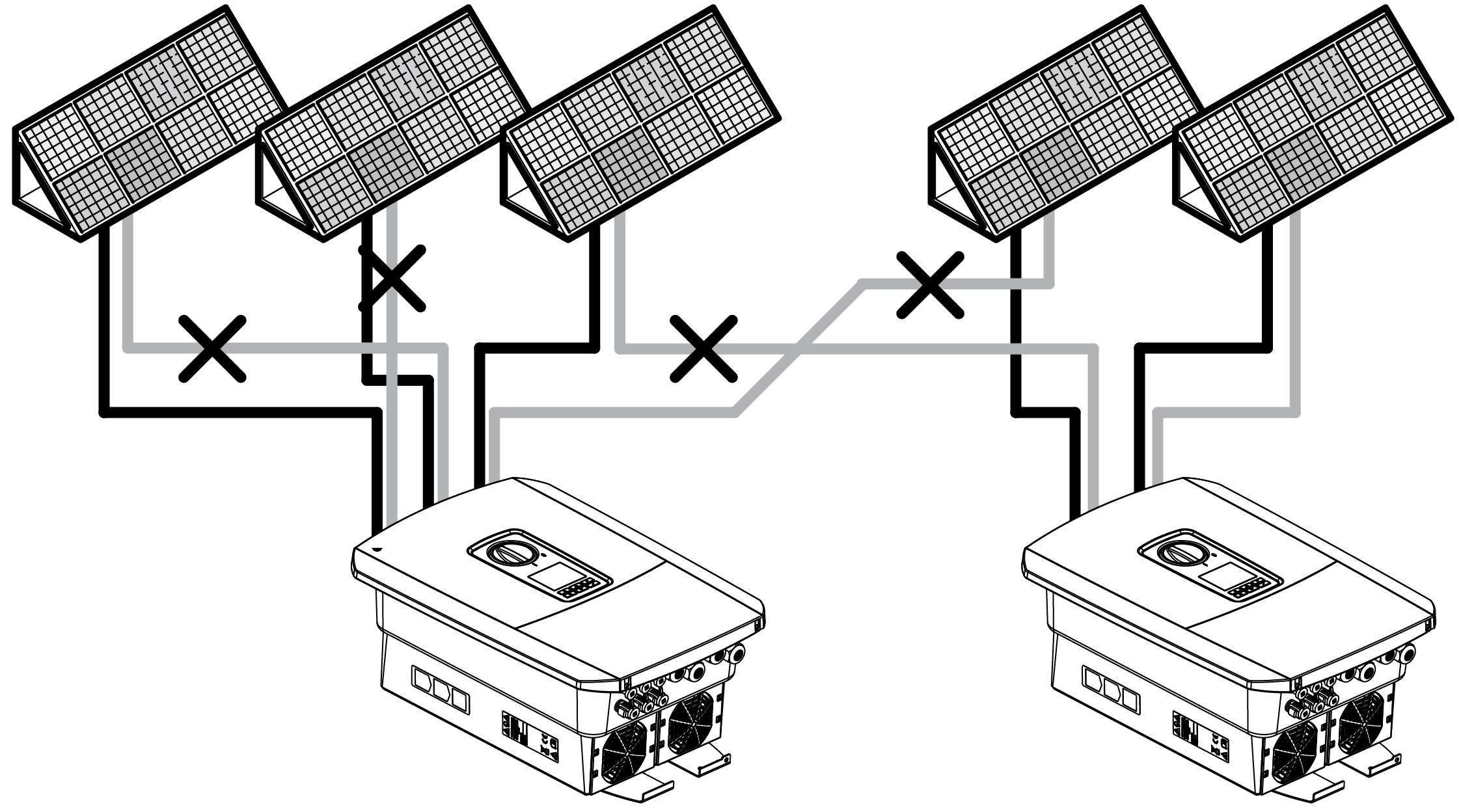 - Jeśli w systemie fotowoltaicznym falowników jest więcej niż jeden, należy uważać, aby podczas podłączania generatorów PV nie powstało podłączenie krzyżowe.