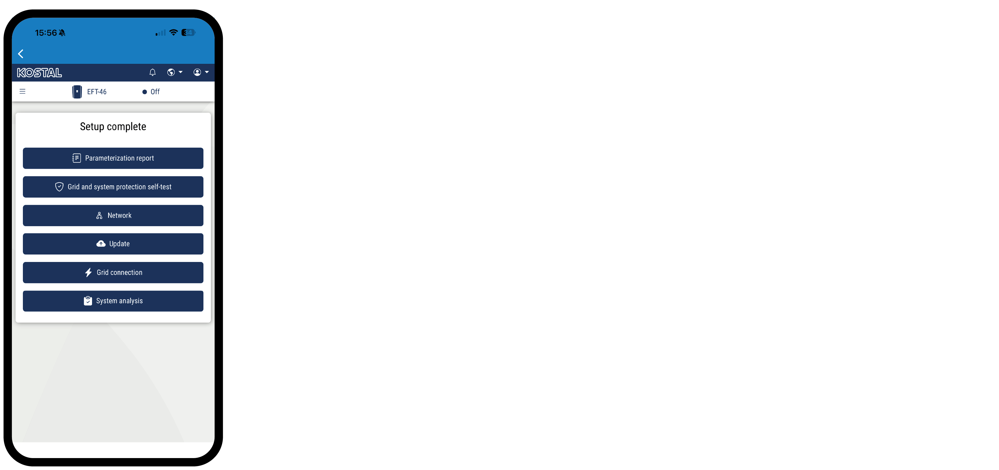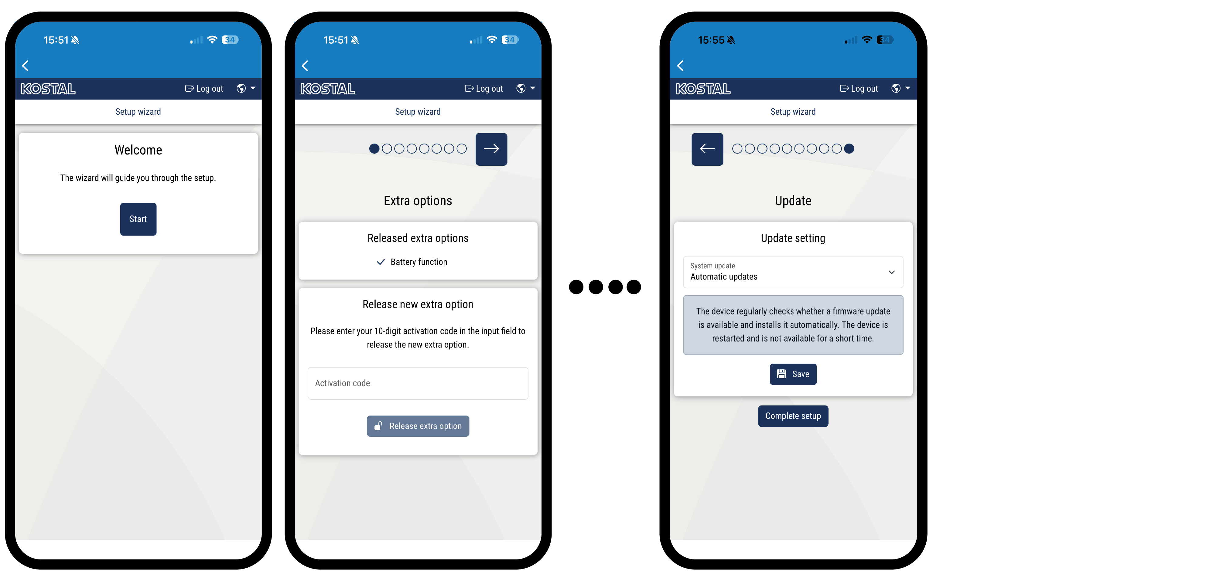 Os códigos de ativação adquiridos e recebidos previamente com a aplicação KOSTAL Solar são transferidos automaticamente para o inversor e podem ser utilizados na configuração inicial.